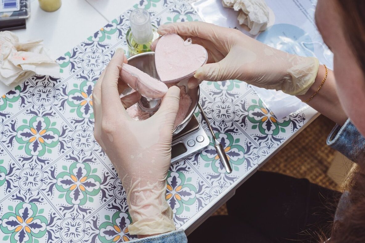 Réalisation d’une bombe de bain effervescente et d’une huile pailletée.